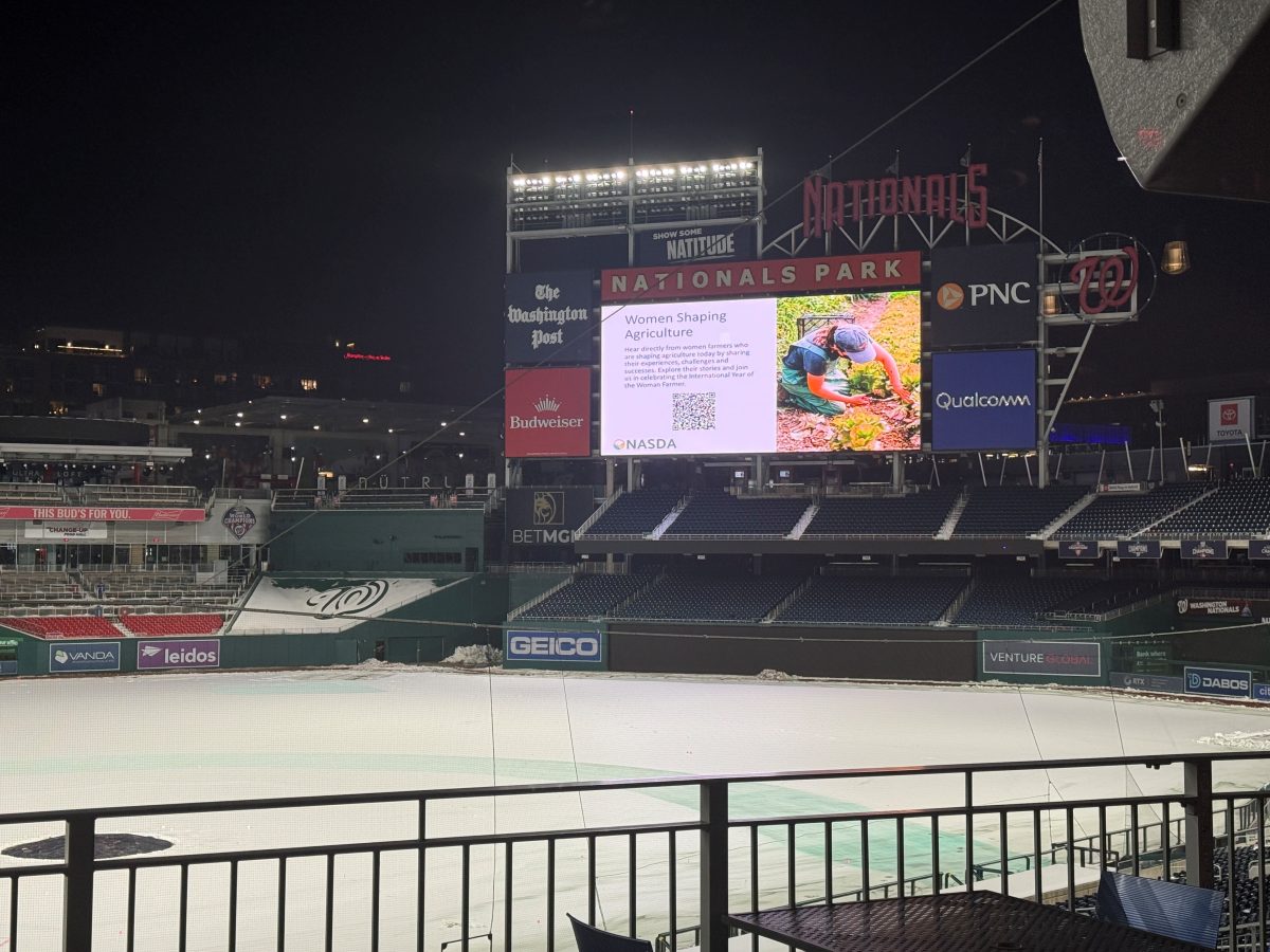The scoreboard at National’s Park displayed the stories of women farmers and additional International Year of the Woman Farmer resources.
